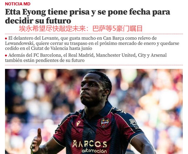 埃永希望尽快解决自己的未来,最好是明年1月冬窗开启时。《世界体育报》表示,巴萨也希望敲定埃永——明年1月就签下埃永,喀麦隆中锋以租借身份继续为莱万特效力。等到7月1日,埃永就能前往巴萨报到。这也是埃永想要的方案,早早确定自己的未来,能安心踢球。