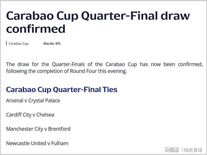 根据联赛杯官网的消息,八强对阵形势分别为,阿森纳面对水晶宫,卡迪夫城面对切尔西,曼城面对布伦特福德,卫冕冠军纽卡斯尔面对富勒姆,前者为主场,安排在12月17日的那个周中,具体的比赛时间待定。